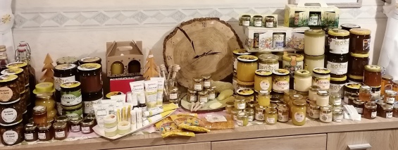 Außerdem gibt es in unserem Hausladen : selbst hergestellte Marmeladen, Glasartikel, echte Bienenwachskerzen, selbst gesiedete Seifen, und andere Imkereiprodukte